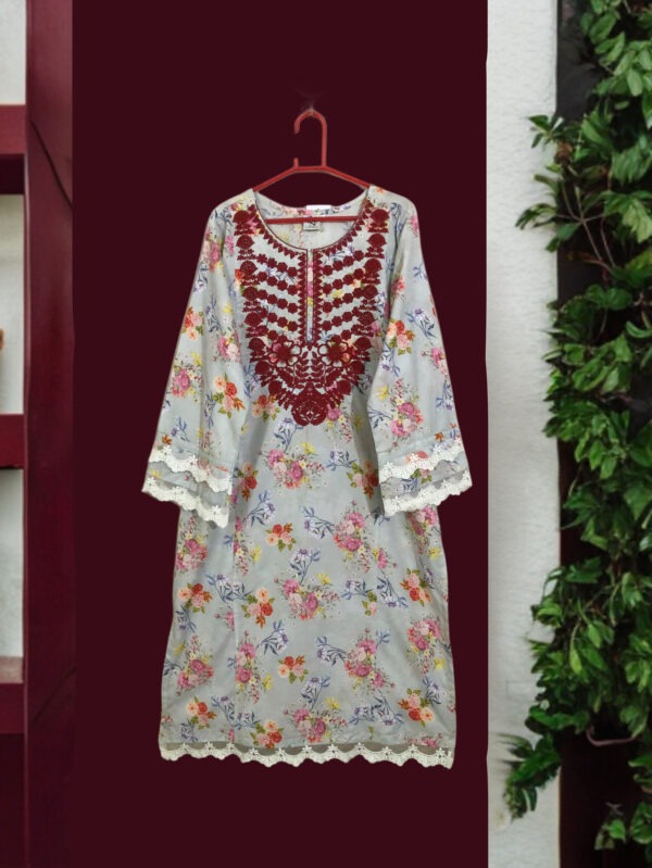 LW-0006 Women’s lawn printed front embroidered sleeves and border lace work long kurti