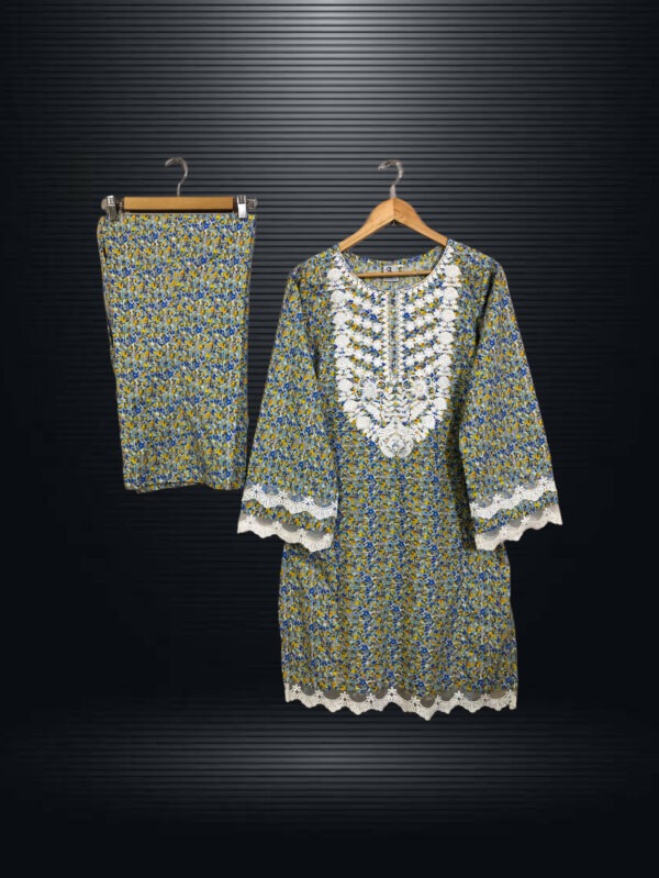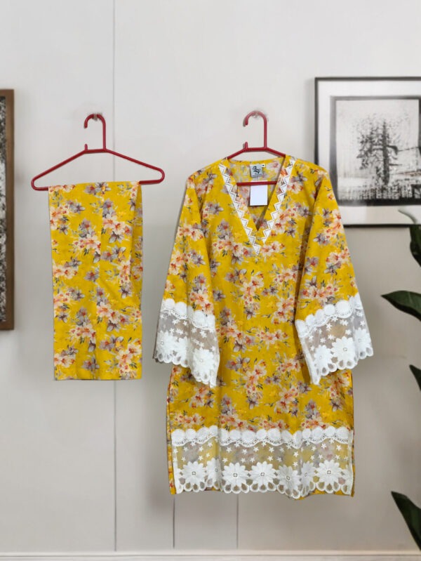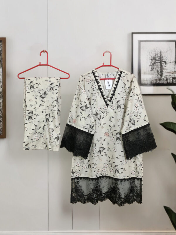 SC-0023 Womenās two piece lawn printed sleeves lace kurti with bell bottom suit