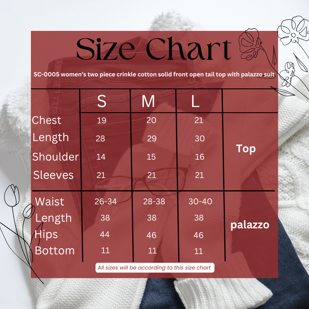 Be the first to review “SC-0005 Women’s two piece crinkle cotton solid front open tail top with palazzo suit” Cancel reply