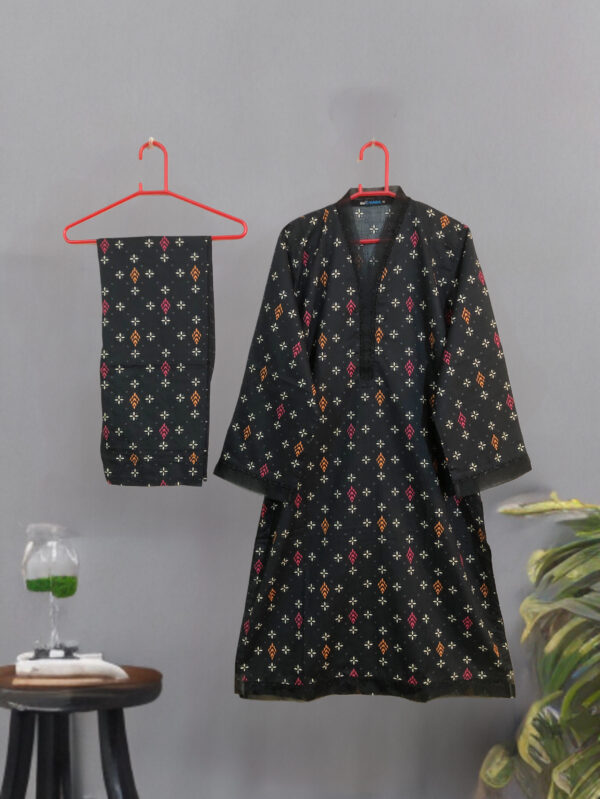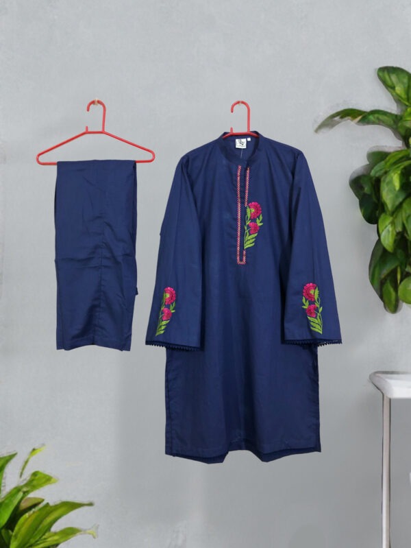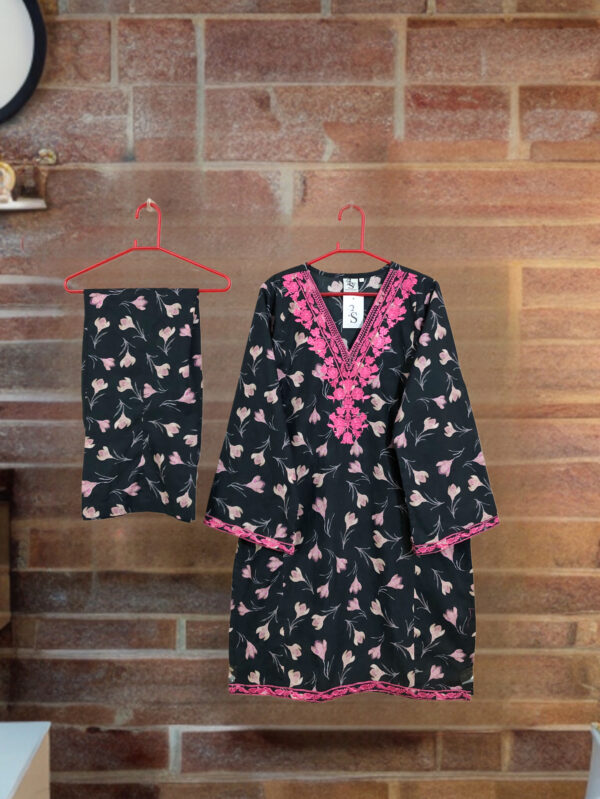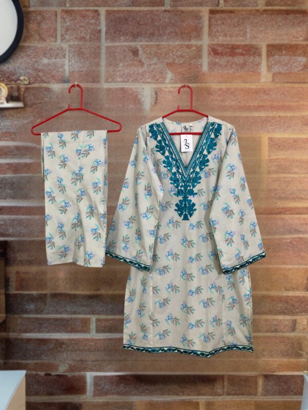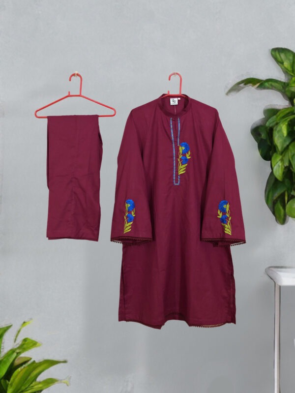 SC-0010 women’s two piece cotton solid front and sleeves embroidered kurti with trouser suit