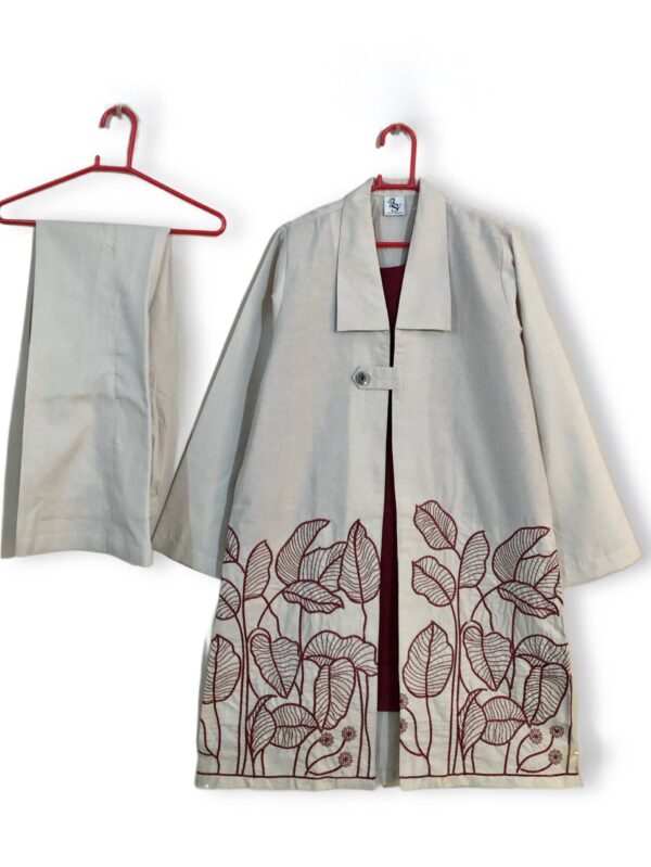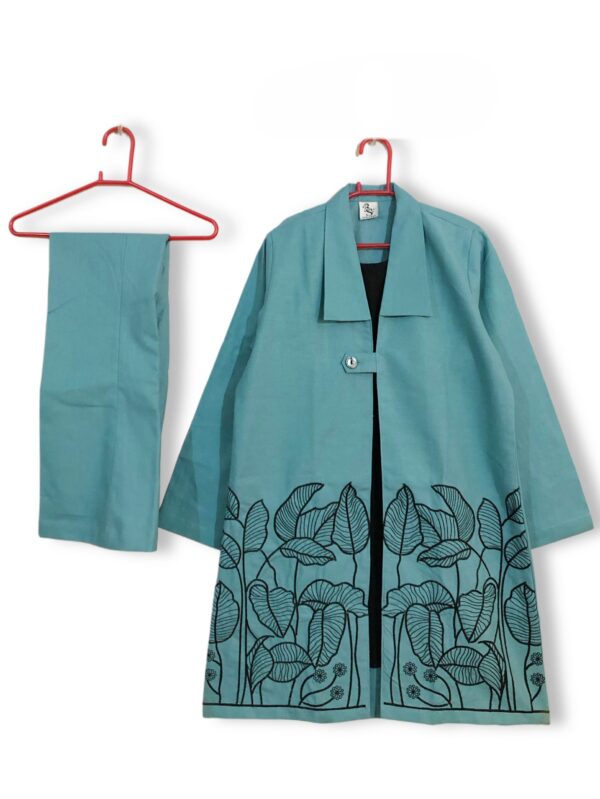 WC-0009 Womenās two piece irish cotton button leaf embroidered coat with attached inner bell bottom suit