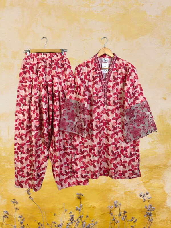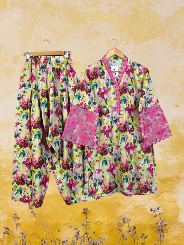 SC-0020 Women’s two piece cotton front button flower embroidered suit