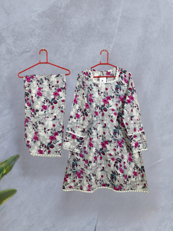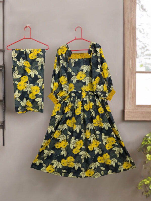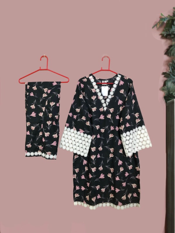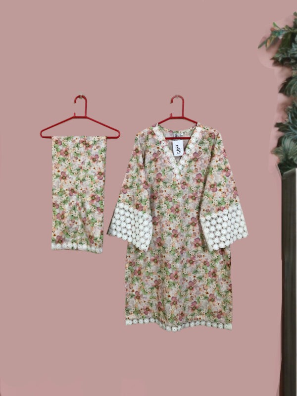 SC-0023 Women’s two piece lawn printed sleeves lace kurti with bell bottom suit