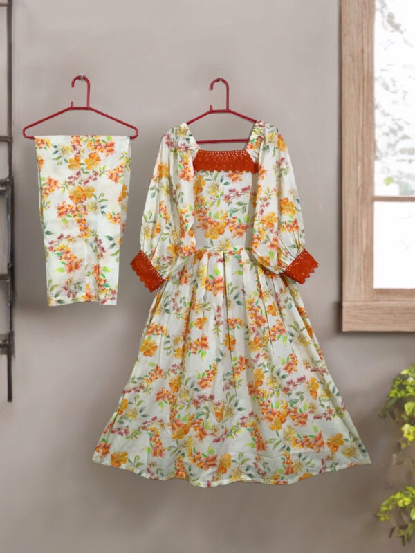 SC-0006 women’s two piece lawn printed lace work elastic shoulder long frock suit